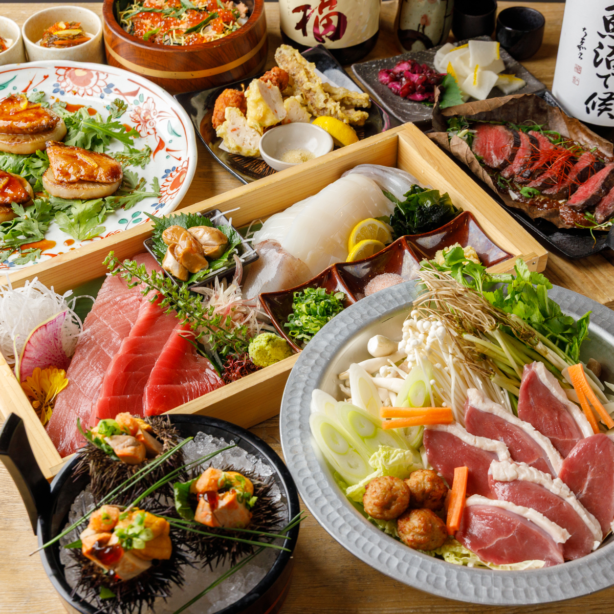 また、「イカの姿造り」「雲丹と自家製あん肝 ジュレポン酢」「アンコウ・カニ饅頭・ごぼうスティック天ぷら」などもご用意しています。